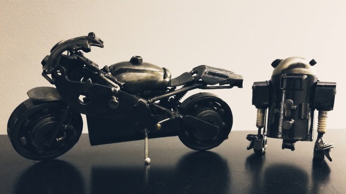 The first thing that came to mind were metal art creations I obtained at Metalpark‘s shop in NYC. These were made mostly from scrap motorcycle parts and other metal remnants to create pieces of art and each were touted to be one of kind. I bought a motorcycle (the handlebars and front wheel moves left and right! ) for my brother thinking what a perfect gift it was to have an art piece made from the very parts of one since he was such an avid rider! He kept it on his TV stand in his living room and after he passed away I now have it displayed on my TV stand next to the one I had bought myself, an R2D2 figure.