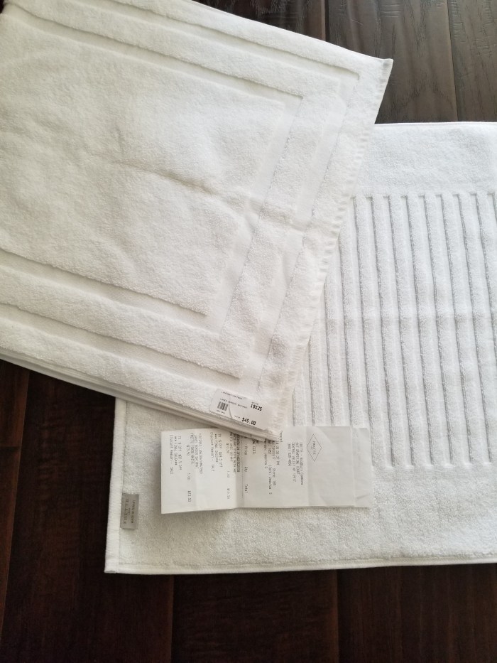 I found myself immediately drawn to their back wall of bath linens. There were 2 different styles of mats I struggled to choose between, retailed at $35-$45 each. A quick check online actually showed one of the mats slightly cheaper than the outlets price tag of $10.50-$13.50 (70% off), but shipping was only free if your order exceeded a certain amount which was well above the cost of a bath mat. Ultimately outlet price was still cheaper than online considering the additional shipping cost required. I ended up buying both at the outlet because I decided I would alternate between the two since one would have to be laundered anyway.