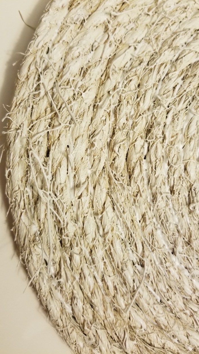 Pleased with the outcome, but still thinking they seemed a bit too plain for my personal taste, I decided to customize my place mats even further by making one side white in the spirit of Diner en Blanc. I kept the other side natural so that I could have variety and switch up my settings depending on my mood and type of meal. I had read a review of a person whose rope place mats got wet causing them to smell pretty bad and lose its shape, so instead of using regular paint, I bought a spray can of white plastidip hoping it would add some water resistance in addition to the color change. The rope had a lot of random fibers sticking out which became much more obvious after spraying it white so I started sniping them away with a pair of scissors.