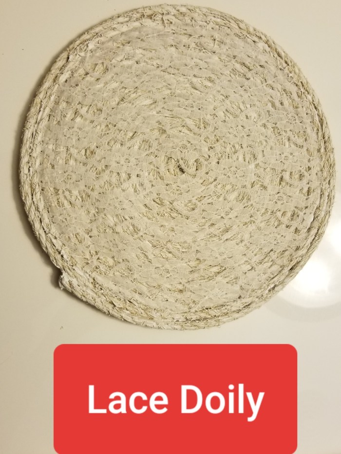 Despite the trim job, they still didn’t look as clean and crisp as the pottery barn ones, which displeased me. I had white lace dollies that I purchased with the intent of using for Diner en Blanc that I knew it would cover most of the place mats while adding a luxurious touch contrasting the natural roughness of the rope while covering the random disarray of fibers. I pulled my glue gun out and attached them to the white side of the place mat.