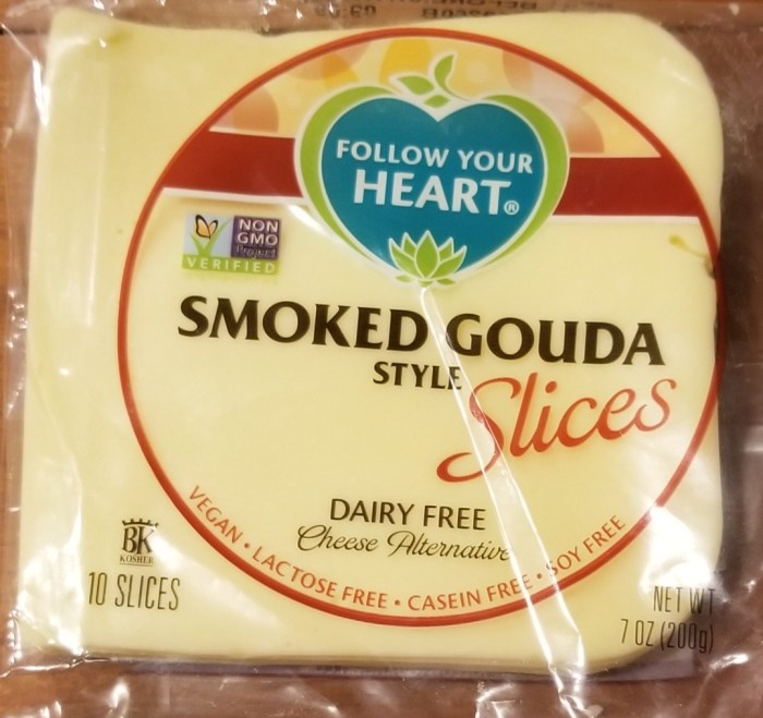 This Smoked Gouda Cheese Alternative by Follow Your Heart which I bought for $5 at Vons (Safeway/Pavilions/Randalls) has such a perfect smokiness to it. The texture is not like Styrofoam like some other cheese alternatives I’ve tried in the past either. It is good and I will definitely buy it again! Can you tell it’s not real cheese? Sure, the texture is not perfectly like real cheese and neither is the taste, but it IS a very well done imitation that I think is worth the cost when I want cheese on my sandwich without putting my body through the terrible digestion process of dairy.