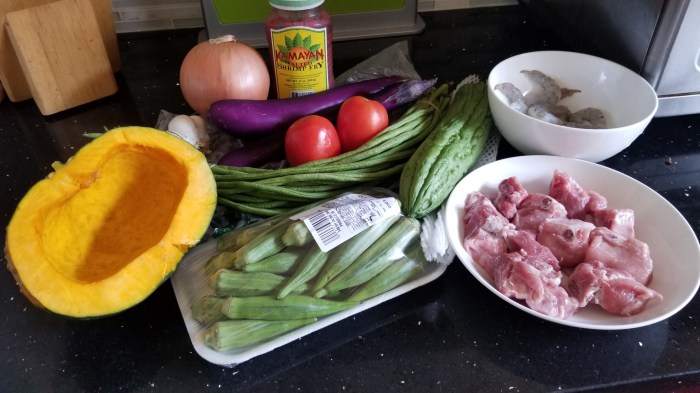 - Add long beans, bittermelon, eggplant, okra, shrimp, and several pieces of chicharrones (pork rinds)